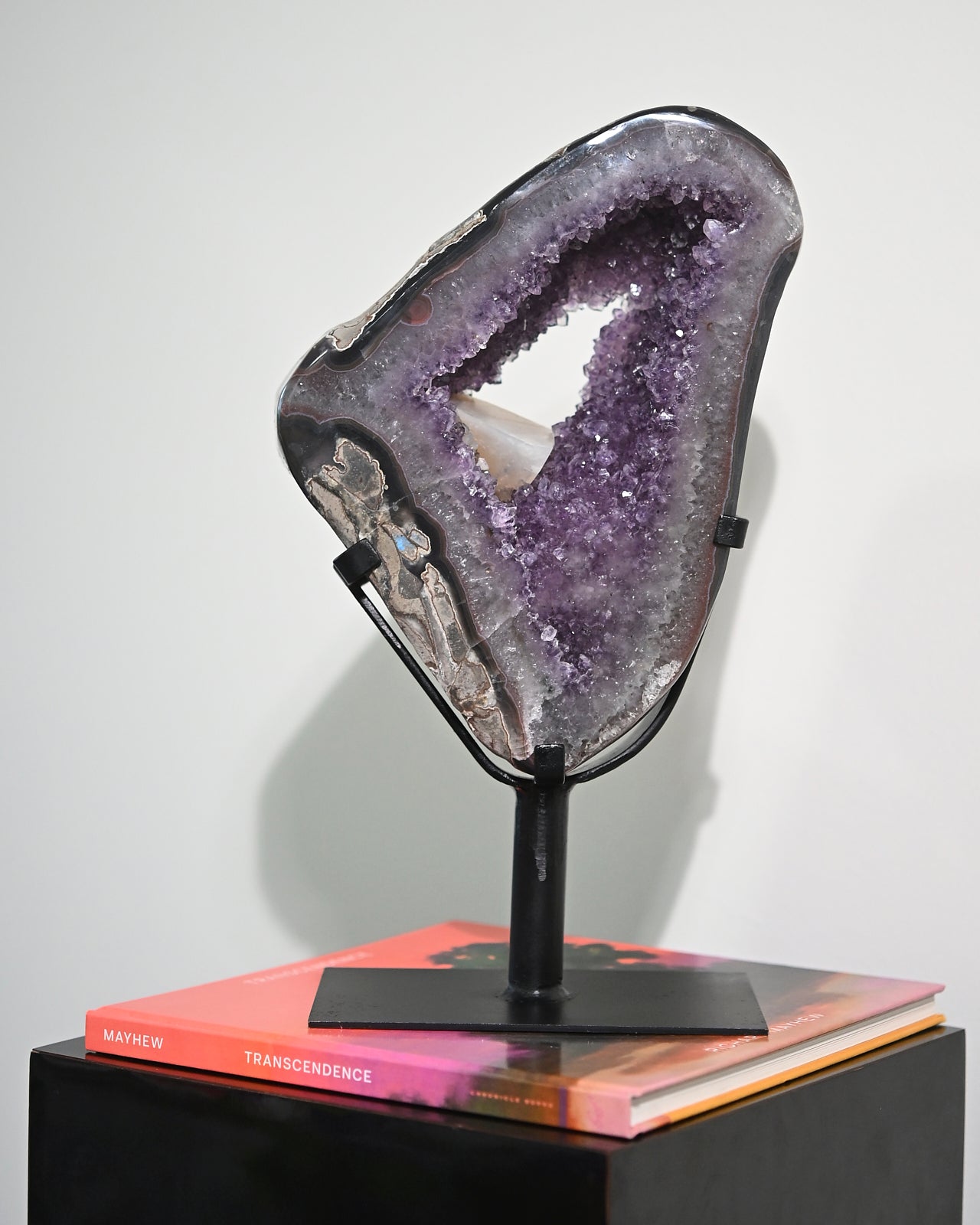 Comes with an amethyst crystal collectors card. You will receive the exact crystal shown. It comes on a custom mounted stand, the stand is removable so you can use this as a cluster laying flat as well.