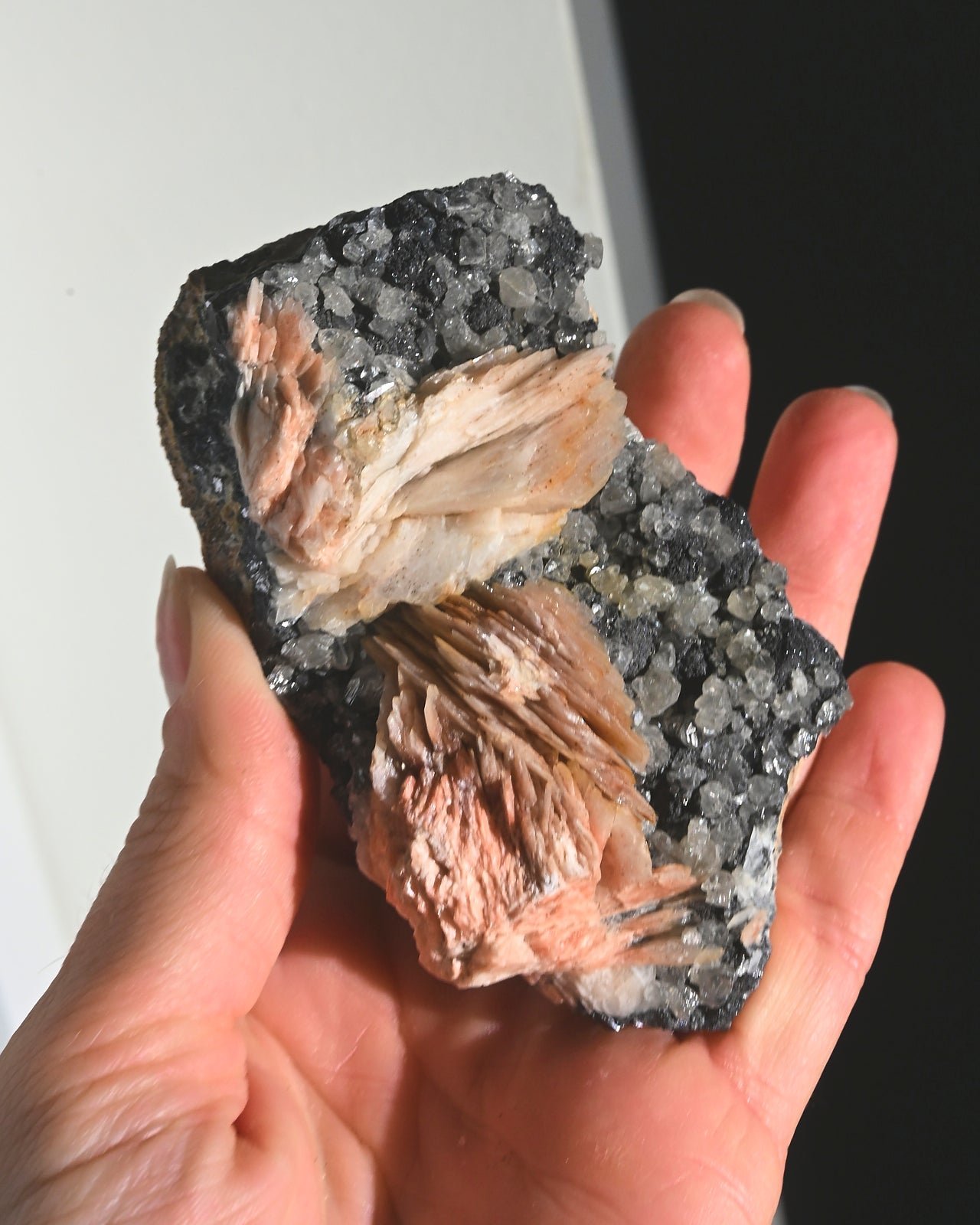 Barite’s delicate, fan-like formations symbolize clarity and energetic alignment, while Galena provides powerful grounding and protective energy. The glittering Quartz clusters throughout offer amplification and balance, creating a triple-threat mineral trio ideal for both spiritual use and sophisticated display.