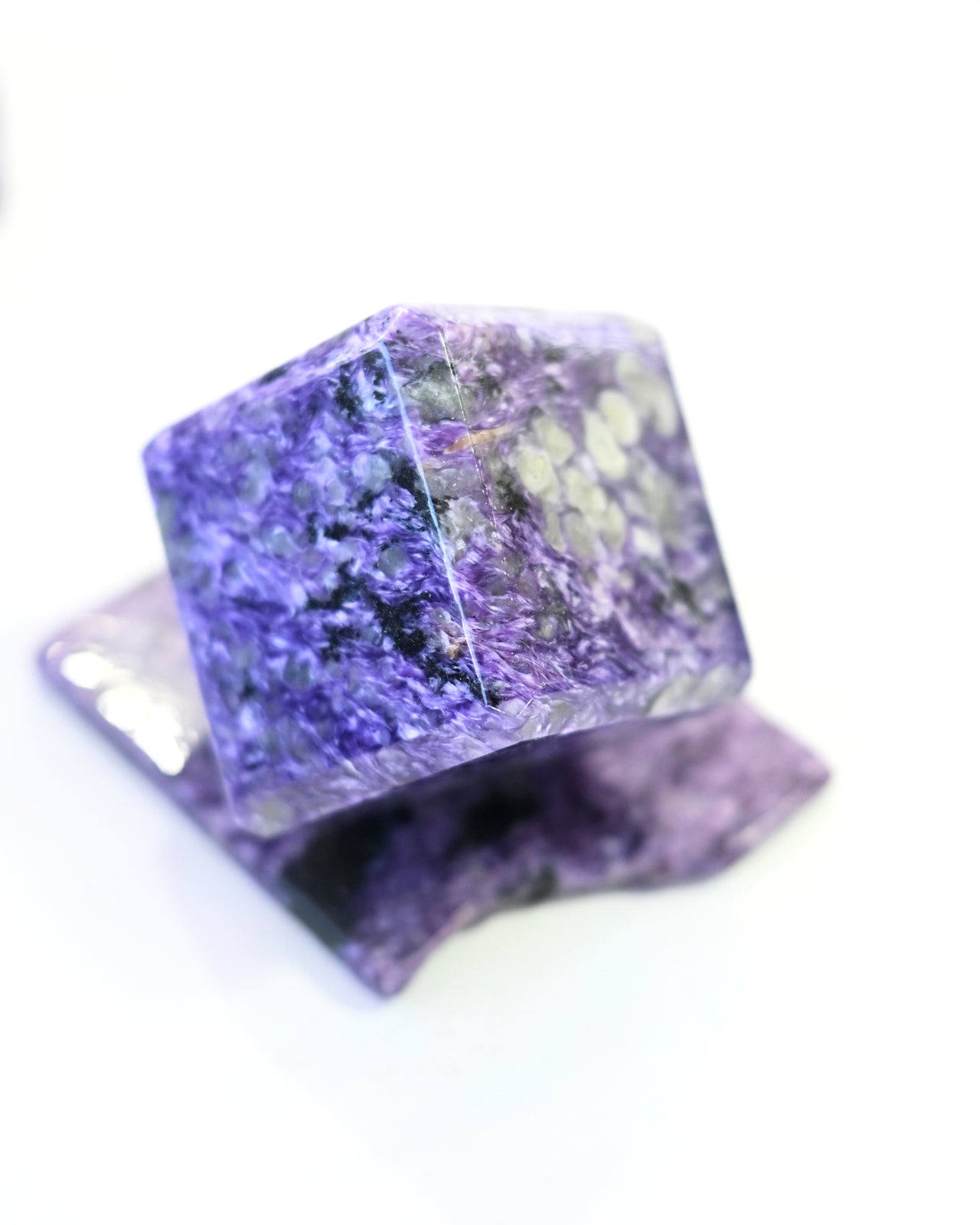 Exuding elegance and rarity, this Charoite Cube on Base showcases the captivating lavender-to-violet hues and swirling patterns reminiscent of the Northern Lights. Sourced exclusively from Siberia, Russia, Charoite is an exceptionally rare gemstone, first discovered in the 1940s near the Chara River, from which it takes its name.