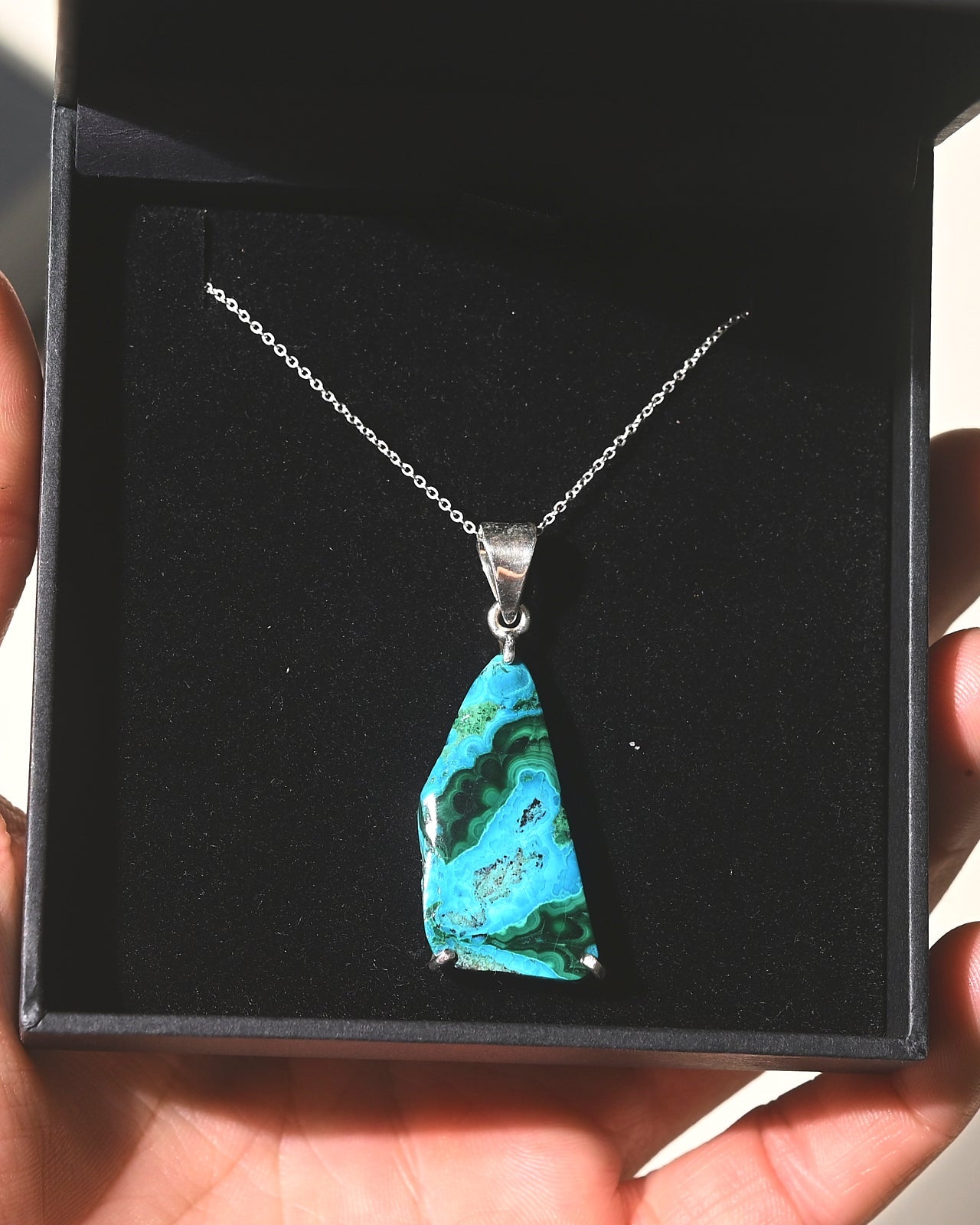 This one-of-a-kind Chrysocolla Malachite pendant, set in luxurious 925 sterling silver, is a breathtaking fusion of vibrant blues and deep greens, embodying the harmony of earth and water. A stone of empowerment and transformation, Chrysocolla Malachite is known for its ability to soothe emotions, inspire confidence, and enhance communication—perfect for those seeking balance and self-expression.