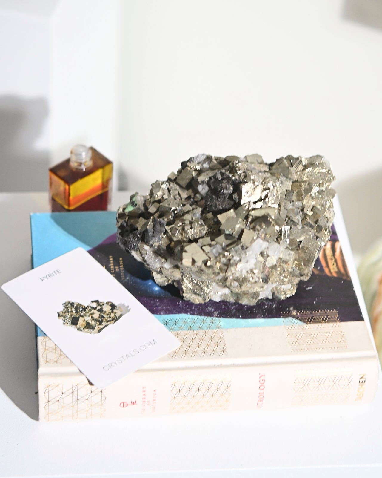 The combination of reflective Pyrite and clear Quartz creates a powerful energy piece, ideal for collectors, home styling, or intention-setting altars. Each angle reveals new detail, from tiny terminations to glimmering metallic facets.