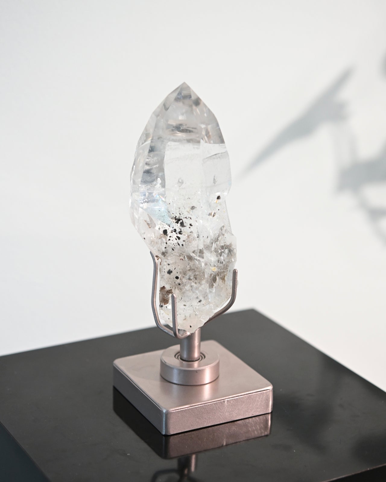 With its natural striations, shimmering clarity, and intricate formations, this crystal radiates high vibrational energy, making it an exceptional choice for energy workers, healers, and discerning collectors. The custom stand elevates its presentation, allowing you to showcase its brilliance from multiple angles while keeping its powerful energy undisturbed.