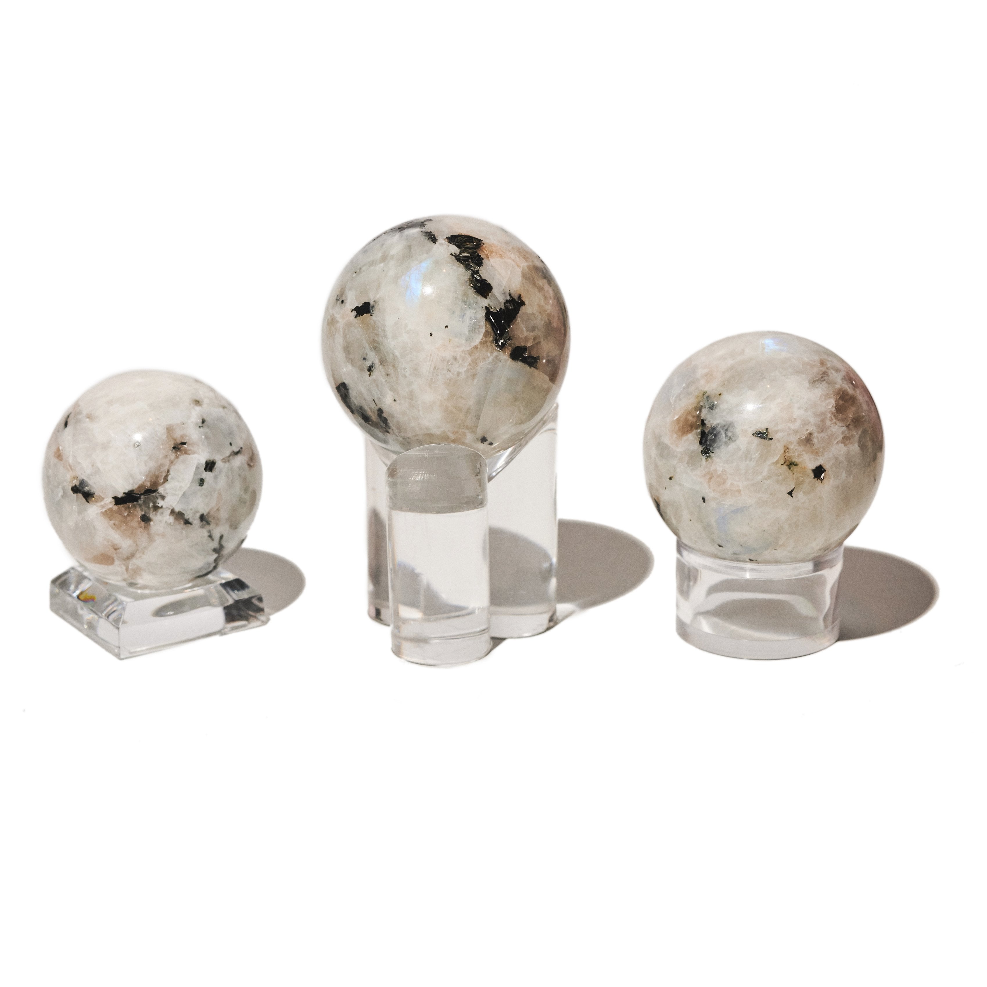This luminous Rainbow Moonstone sphere is a symbol of inner knowing, divine timing, and feminine power. Polished to reveal its signature iridescent glow, each sphere is a one-of-a-kind treasure that reflects the light of your inner guidance.